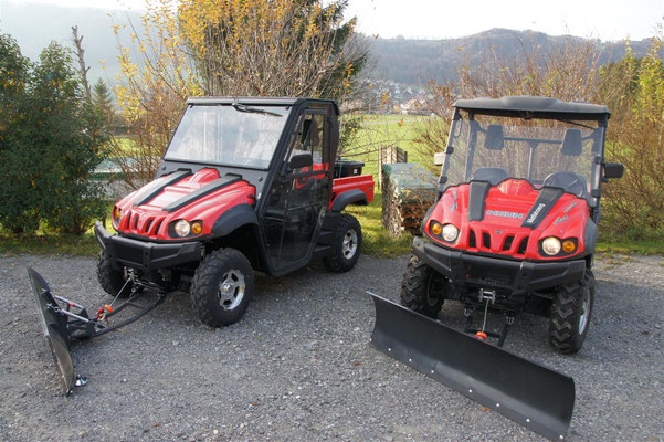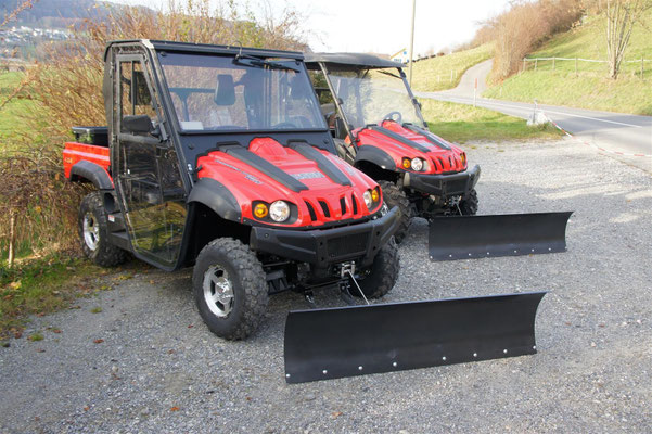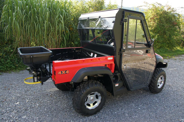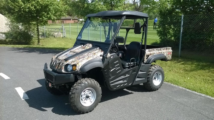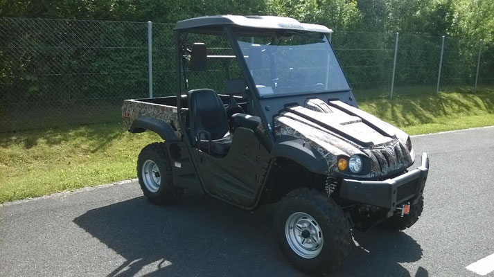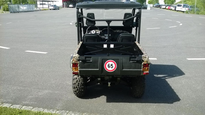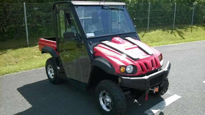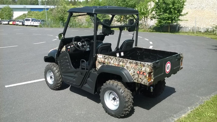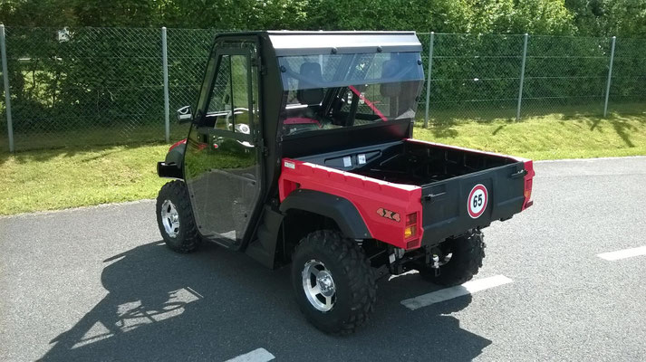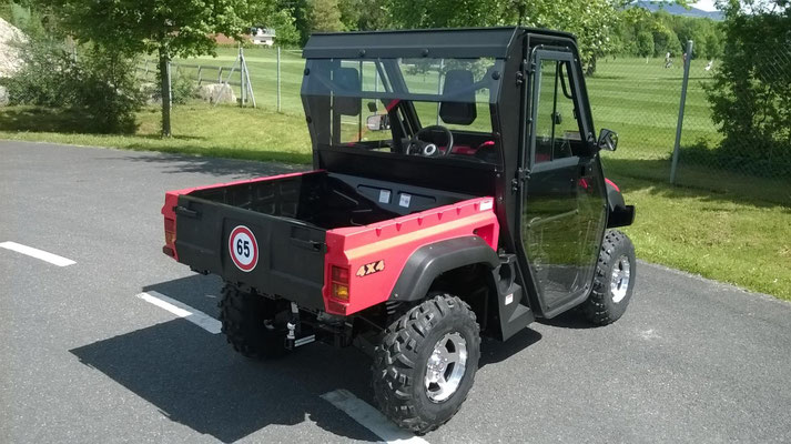 Das UTV 500 4x4 ist mit StVZO-Ausrüstungen, (Schweinwerfer, Blinker, Hupe etc.) ausgestattet und damit für den öffentlichen Straßenverkehr zugelassen. Mit 14.8 kW (20 PS) rollt der kleine Allzwecktransporter immerhin mit beachtlichen 65 km/h über den Asphalt.