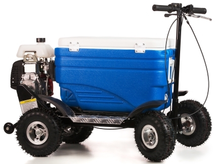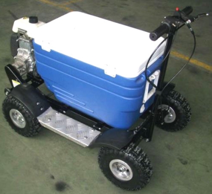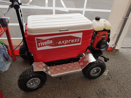 Fassungsvermögen von 48 Liter und das ganze wird von einem 2 PS starken 4-Takt Motor angetrieben. Auf der Hinterachse ist eine Scheibenbremse montiert, um ein sicheres Abbremsen und Anhalten zu