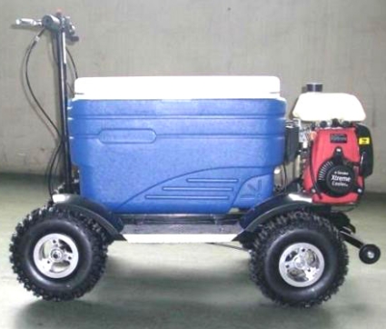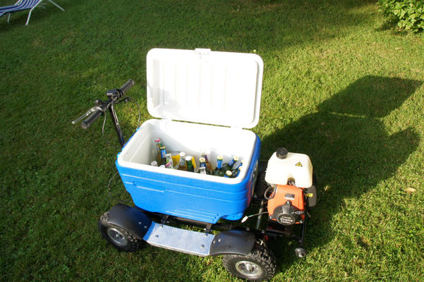 Dieser Cooler Scooter ist mit einem robusten Stahlrahmen und Geländepneus ausgestattet. Die Kühlbox hat ein