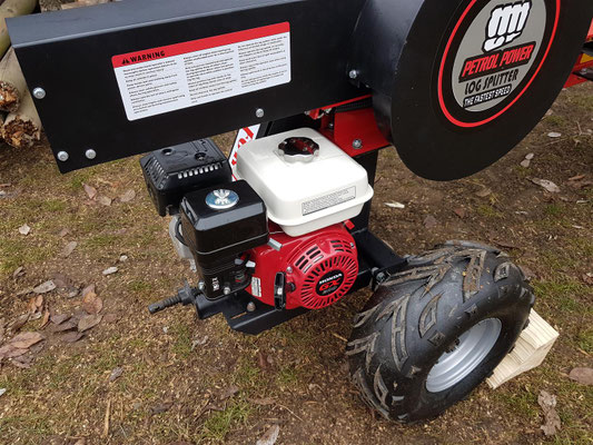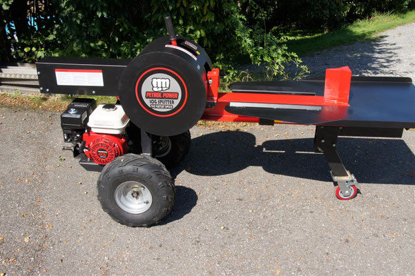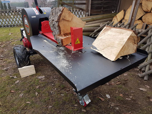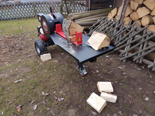 Zahnstangenantrieb ist langlebig und man muss nicht mit Hydrauliköl arbeiten. Durch das Fahrgestell und die Kugelkopfkupplung lässt sich der Holzspalter einfach und schnell bewegen.